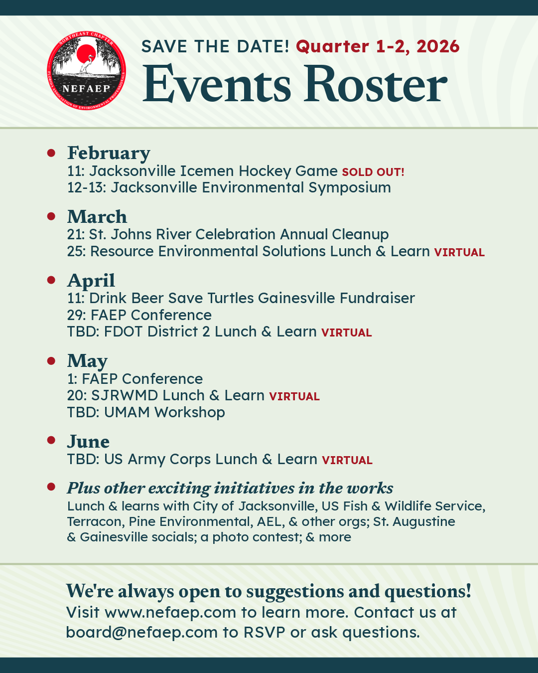 In 2025, NEFAEP hosted engaging socials across Gainesville, Jacksonville, and St. Augustine; supported the annual St. Johns River Cleanup; delivered virtual Lunch & Learns with leading environmental agencies; organized field visits and community conservation activities; and offered hands‑on member outings. With this momentum, 2026 is shaping up to be an exciting year for environmental professionals across Northeast Florida.